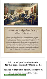Celebrating the 250th anniversary of the Declaration of Independence, The Continental Road exhibition opens this Sunday February 15 at 1pm. Curator Billy Mincey will give an overview and walk through at 2pm and the newly appointed Town of Tuxedo Historian, Alex Prizgintas, will be introduced. Also on view is the 125 Years of Tuxedo Park School exhibition. Both exhibitions are open every Sunday from 1 to 4pm at the Tuxedo Historical Society, 241 Route 17, opposite Tuxedo Railway Station.